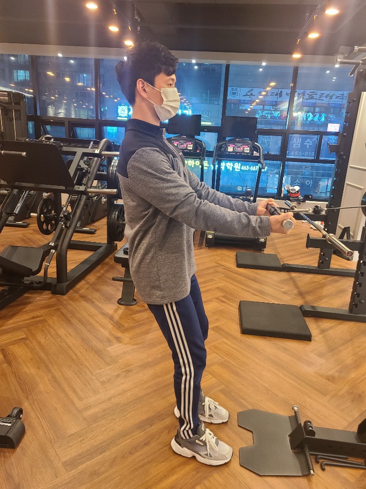 우선은 이렇게 스트레이트 바를 언더 그립으로 잡아주시면 좋답니다!