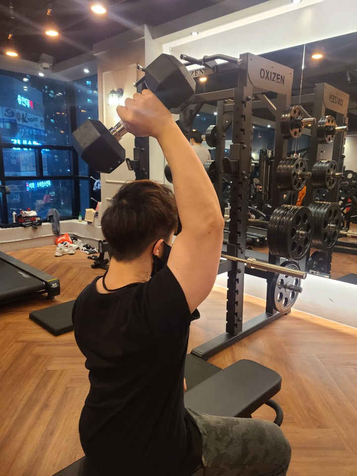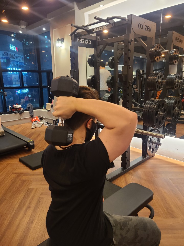 그다음 머리뒤로 넘겨주시면 되시는데 반대편손은 덤벨 들고있는 팔꿈치쪽을 잡아주셔도 되며