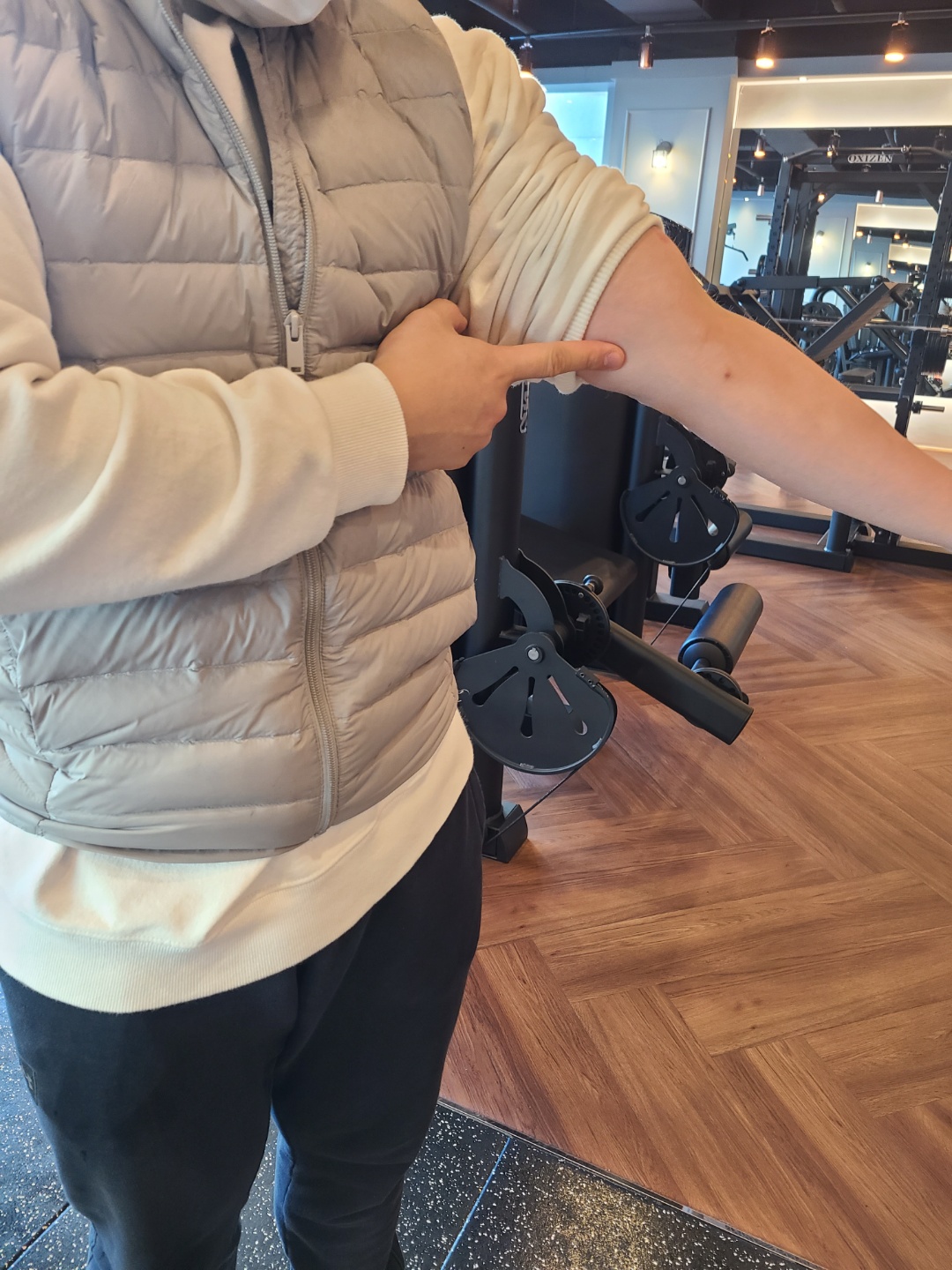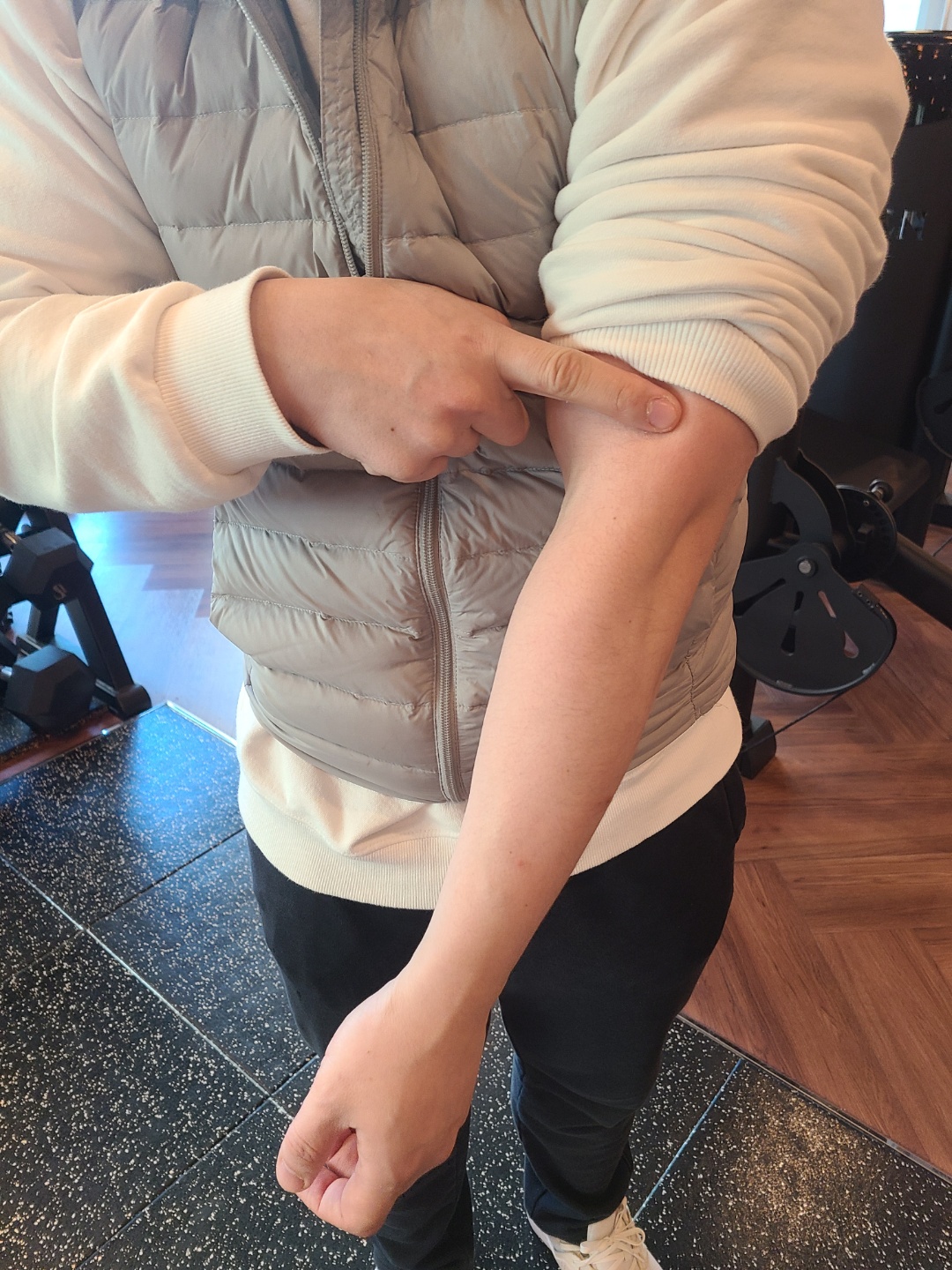 어깨는 앞으로 굽어지기에 팔꿈치 바깥쪽의 과활성화로 인하여 지속적인 압박에 의해