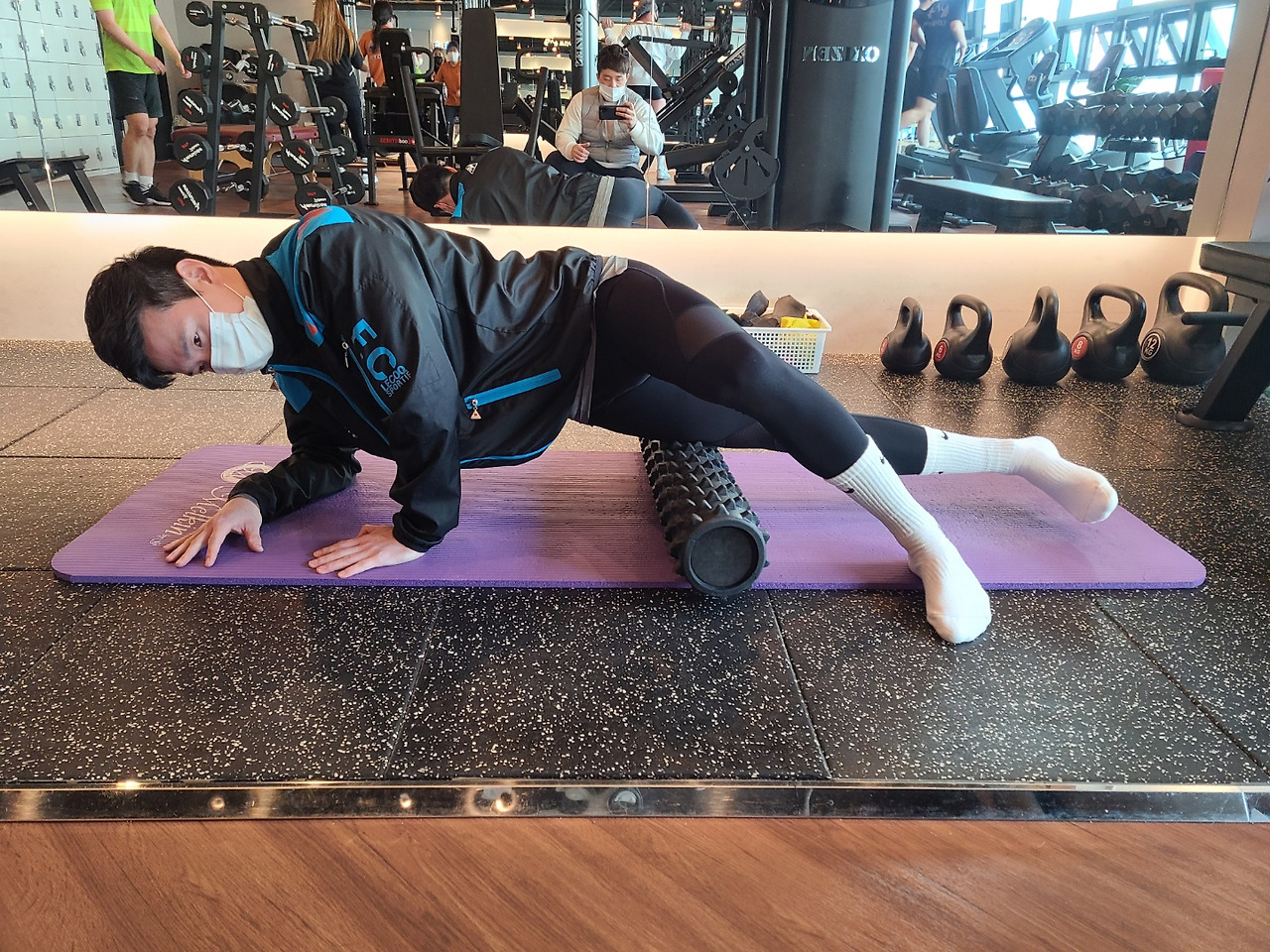 1. 폼롤러 혹은 럼블롤러를 하나 구비해 주신 다음에 위 사진과 같이 옆으로 누워