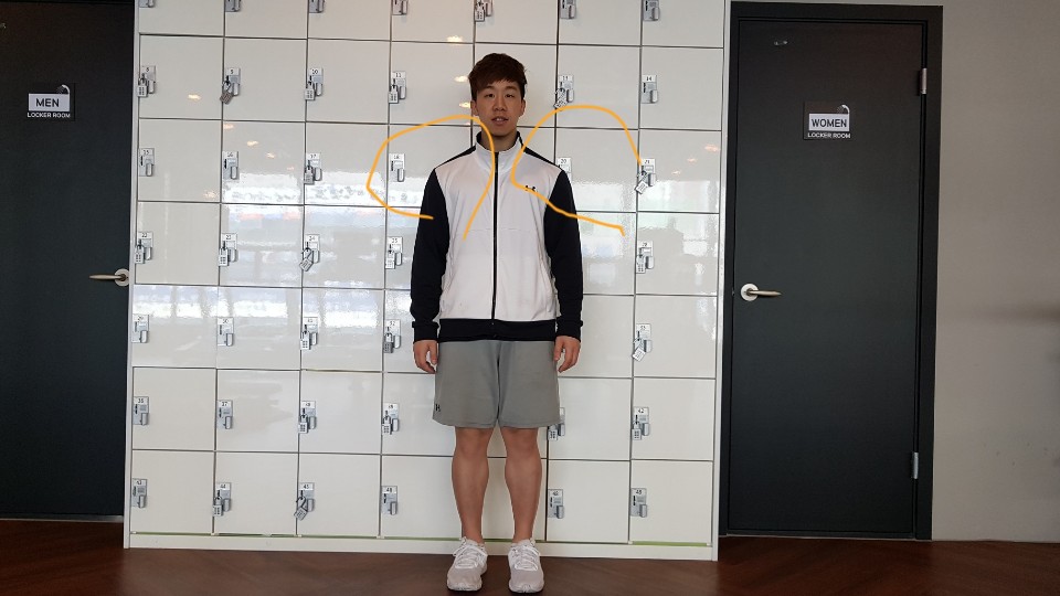 이게 제가 바로 서있는 상태랍니다 그렇다면 제가 바로 서있을 때 승모근은